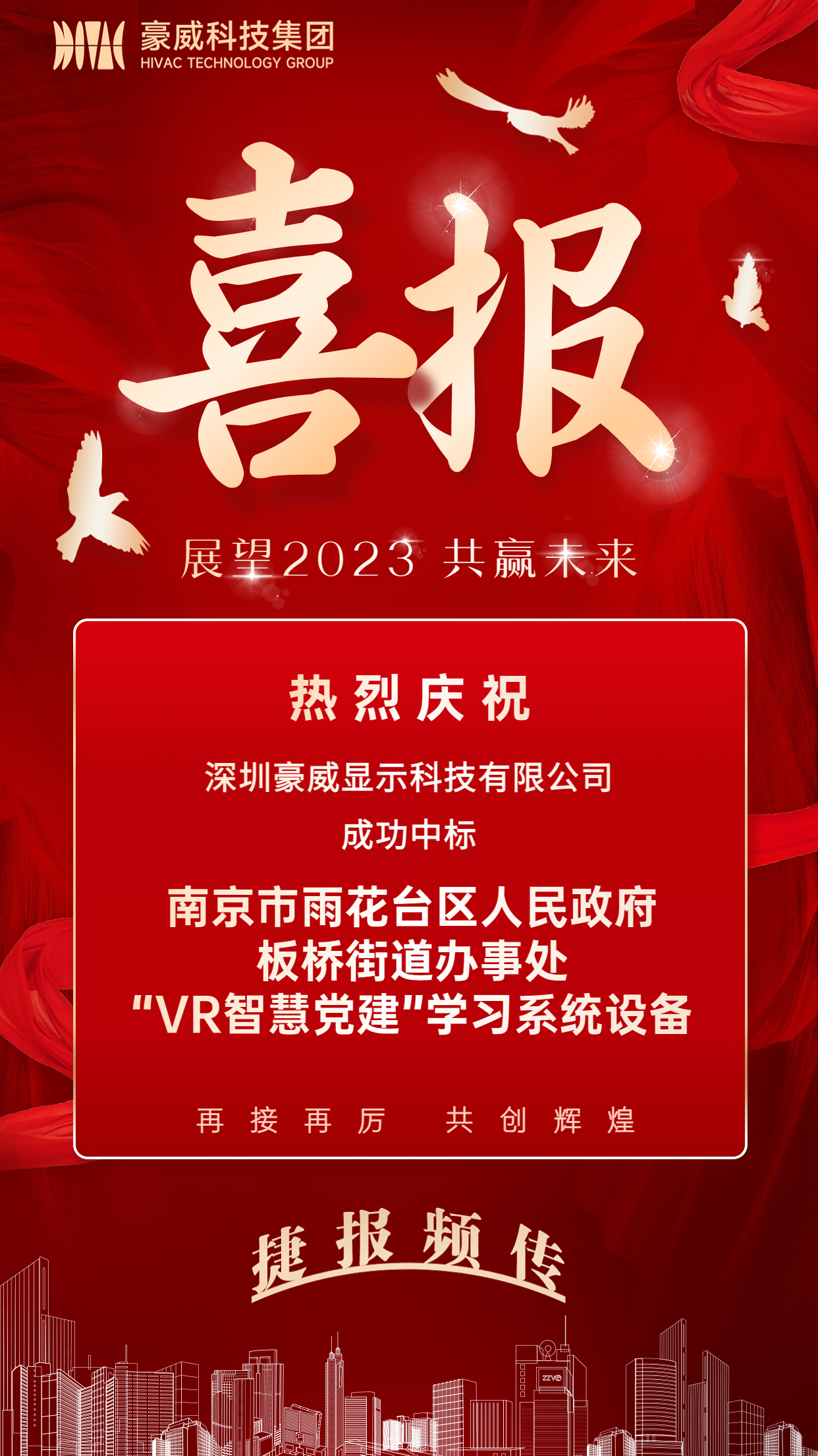 2023年06月13日,我司参与投标的项目:南京市雨花台区人民政府板桥街道办事处“VR智慧党建”学习系统设备成功中标!此次中标增强了公司综合竞争力,夯实公司在新型显示行业的领先地位,也为持续开拓项目积累了宝贵经验。