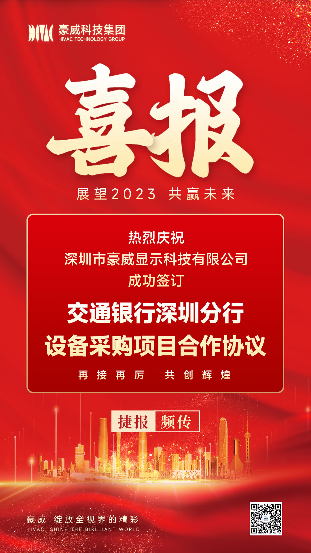 我司与交通银行深圳分行成功签订设备采购项目合作协议!此次合作增强了公司综合竞争力,夯实公司在新型显示行业的领先地位,也为持续开拓项目积累了宝贵经验。